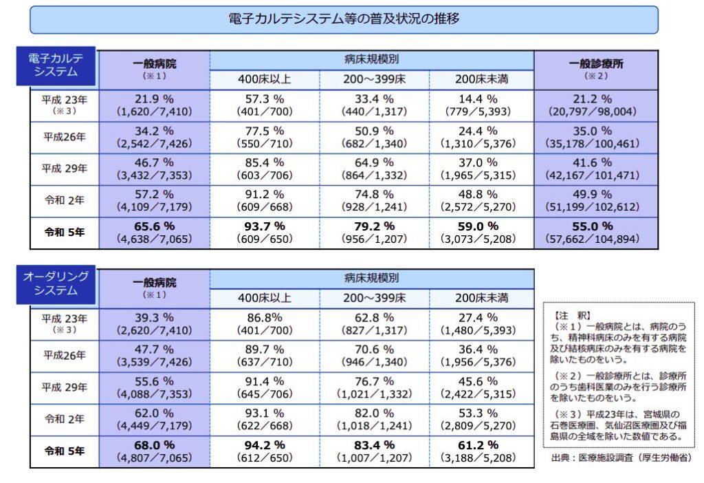 大規模病院ではすでに「当たり前」ですが、中小規模の病院やクリニックでも約半数が導入済み。政府は普及率90%を目指して支援を強化しているので、これから数年で電子化の波はさらに加速します。