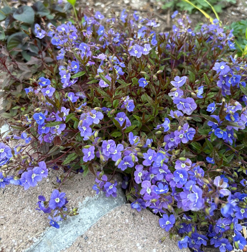 ふんわりと横に広がるベロニカと、縦にスッと立ち上がるアジュガが並ぶことで、お庭に立体感が生まれます。