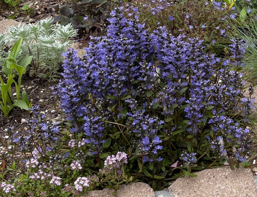 アジュガの凄さは、その「広がる力」です。ランナー(匍匐茎)を伸ばして、隙間を埋めるようにどんどん広がってくれるので、まさに「生きた絨毯」。 5月になると、そのチョコレート色の葉の間から、濃い青紫の花穂がスッと立ち上がります。