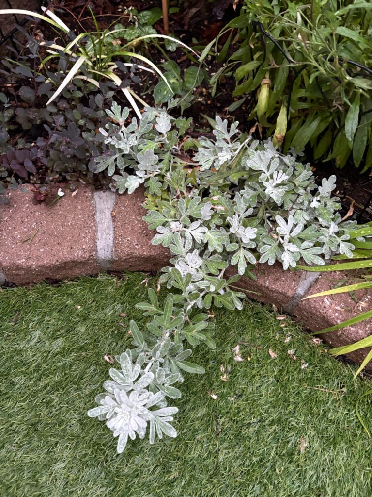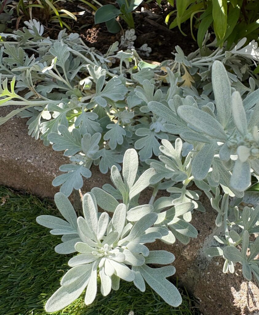 アルテミシアの最大の魅力は、その明るさです。 曇り空の日でも、この子が足元にいるだけで、そこだけスポットライトが当たっているかのように明るく見えます。ベロニカの銅葉や、アジュガの濃い青の隣に植えることで、お互いの色を引き立て合う最高の引き立て役になってくれます。