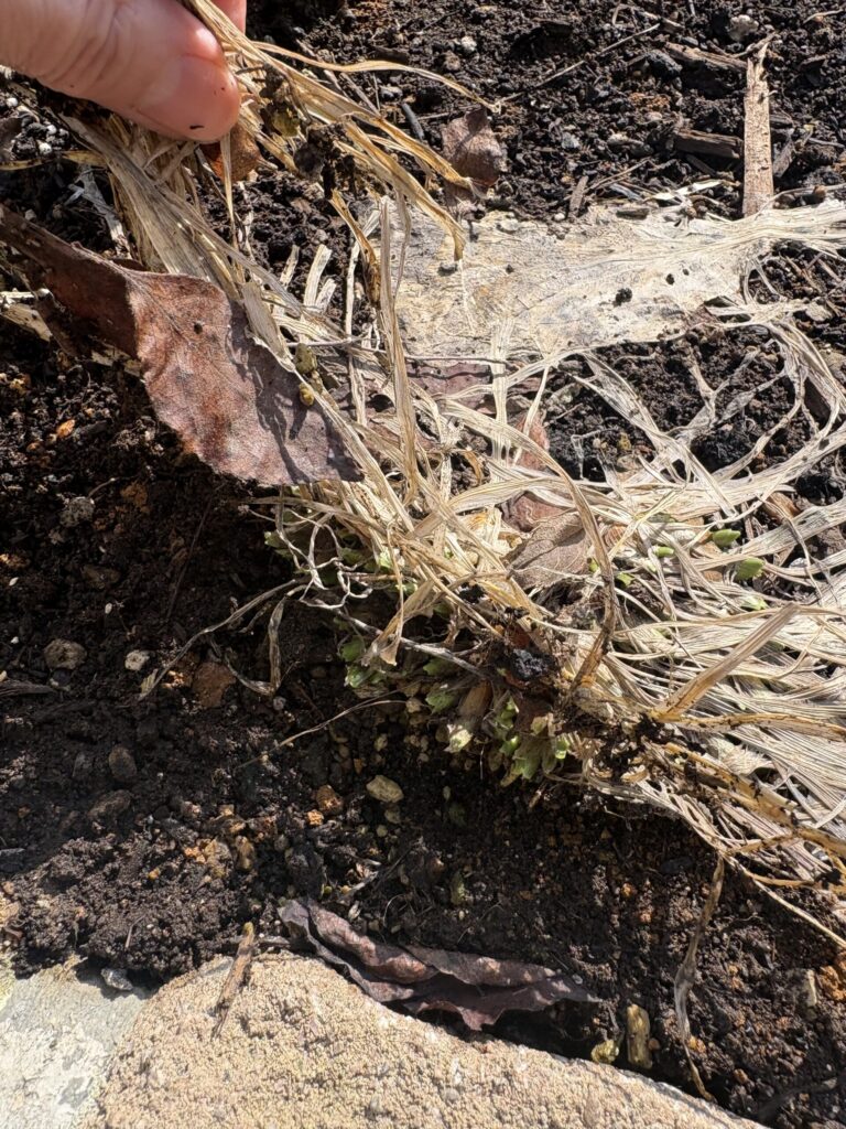 - 株元を指でそっと掻き分けて、新芽が出ているかを見る
