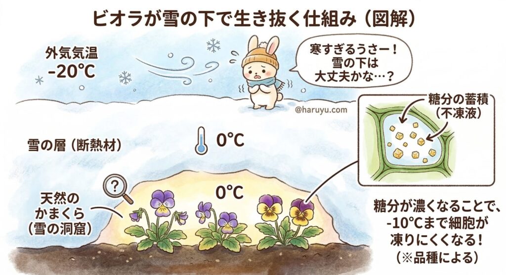たとえ外がマイナス20度でも、雪の下は0度前後に保たれています。雪は「天然のかまくら」として、冷たい寒風からビオラを優しく守り、さらに適度な水分も補給してくれているのです。